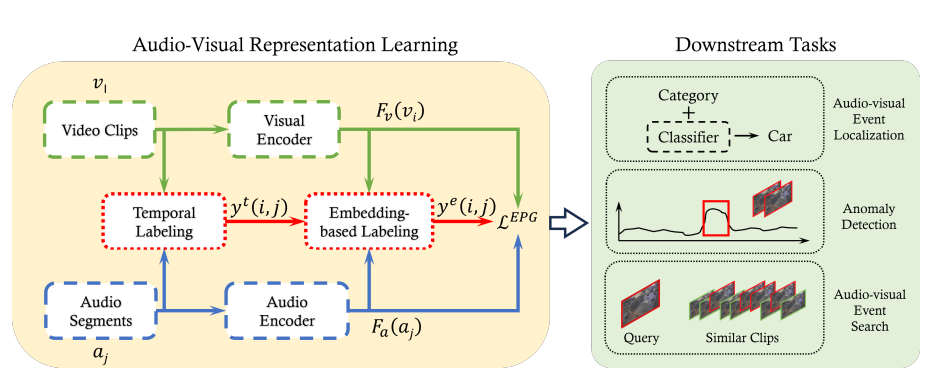 The results confirmed the superiority of this method. The EPG-trained representations significantly outperformed existing baselines, achieving a 10% performance increase in the task of audio-visual event localization. The efficacy and generality of these features were further validated across a range of applications, including unsupervised anomaly detection and event search. These findings empirically prove that the EPG framework successfully resolves the false negative problem and learns robust, versatile representations from complex, unlabeled surveillance streams in real-world scenarios.